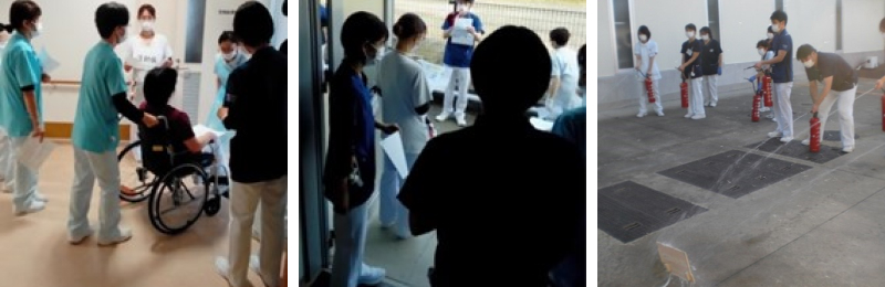 当院では地震や火災など災害発生時でも落ち着いて対応できる様に災害訓練を行っております。透析中に災害が発生し治療の継続が不可能となった場合には、安全かつ迅速な返血作業と避難誘導が求められます。そのためスタッフと患者さまが協力して災害訓練を実施しています。