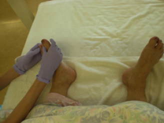 また血液が末端に届けられないために傷が治らず、感染を起こすと潰瘍(かいよう)化して悪化すると壊疽(えそ)となり、足の切断にまで至る事があります。当院で行っているフットケアは、この様な足の病変をいち早く発見し治療をして、普段の生活の中で注意する点などをお伝えしています。当院では全ての患者さまにフットケアを行う担当看護師が割り当てられており、定期的に足の状態(爪・水虫・傷など)をチェックしています。