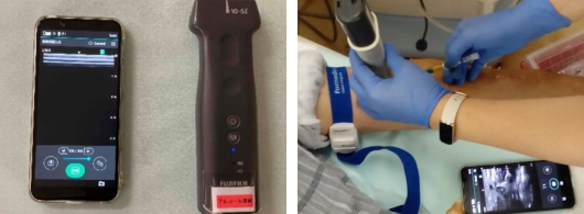 シャントは透析患者さまにとって大切な命綱です。大切な命綱を守るため、当院では超音波エコー検査を適宜行っています。当院ではFUJIFILM社製超音波診断装置FC1を1台保有しており、血流量測定や血管に狭い所が無いか等、ベッドサイドで迅速に検査を行う事で、シャントトラブルへの早期発見が対応可能です。また2021年7月にFUJIFILM社製ワイヤレス超音波画像診断装置iViz airを導入しました。こちらはエコー下穿刺に特化した超音波画像診断装置となっております。小型のハンディエコーとタブレットの構成で省スペース化された事で操作性が向上し、穿刺困難症例に対してスムーズに穿刺が出来ます。