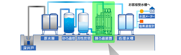 当院では、タクロウ管理工業社製の地下水膜ろ過システムを採用し、さまざまな処理を施すことで上水道としても医療用水としても使用できる安全性を確保しています。