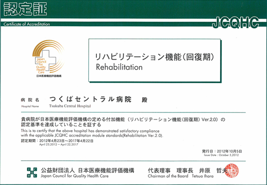 「良質な回復期リハビリテーションを提供するための組織運営」「回復期リハビリテーションに関わる職員の専門性」「チーム医療による回復期リハビリテーション・ケアの実践」において機構が第三者評価をおこない認められた病院に対して発行する認定証になります。