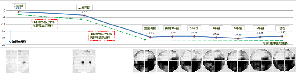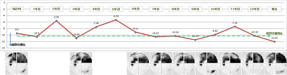 初診時から進行した視野障害が確認された緑内障の患者様。10年以上の長期にわたる点眼治療継続が功を奏し、緑内障の進行なく視野を維持できている。